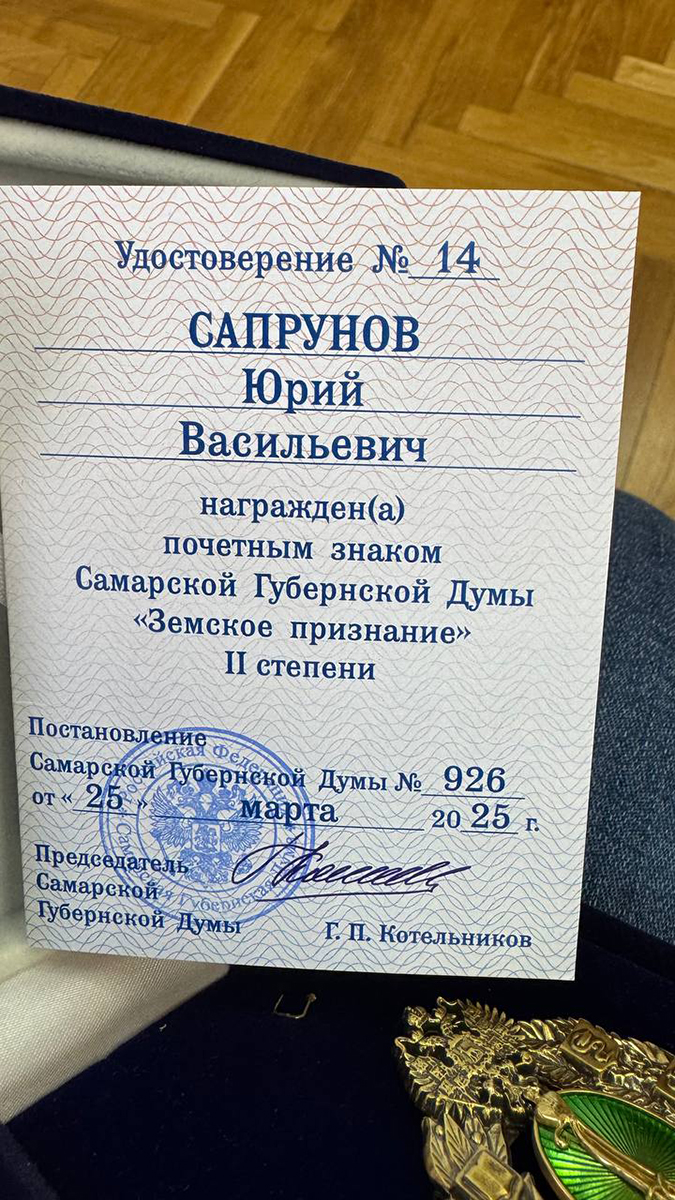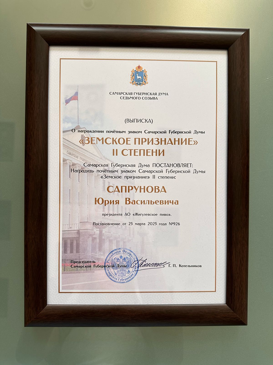 Президент АО «Жигулевское пиво» Юрий Васильевич Сапрунов награжден Почетным знаком Самарской Губернской Думы "Земское признание" II степеней за выдающиеся заслуги перед Самарской областью и ее населением